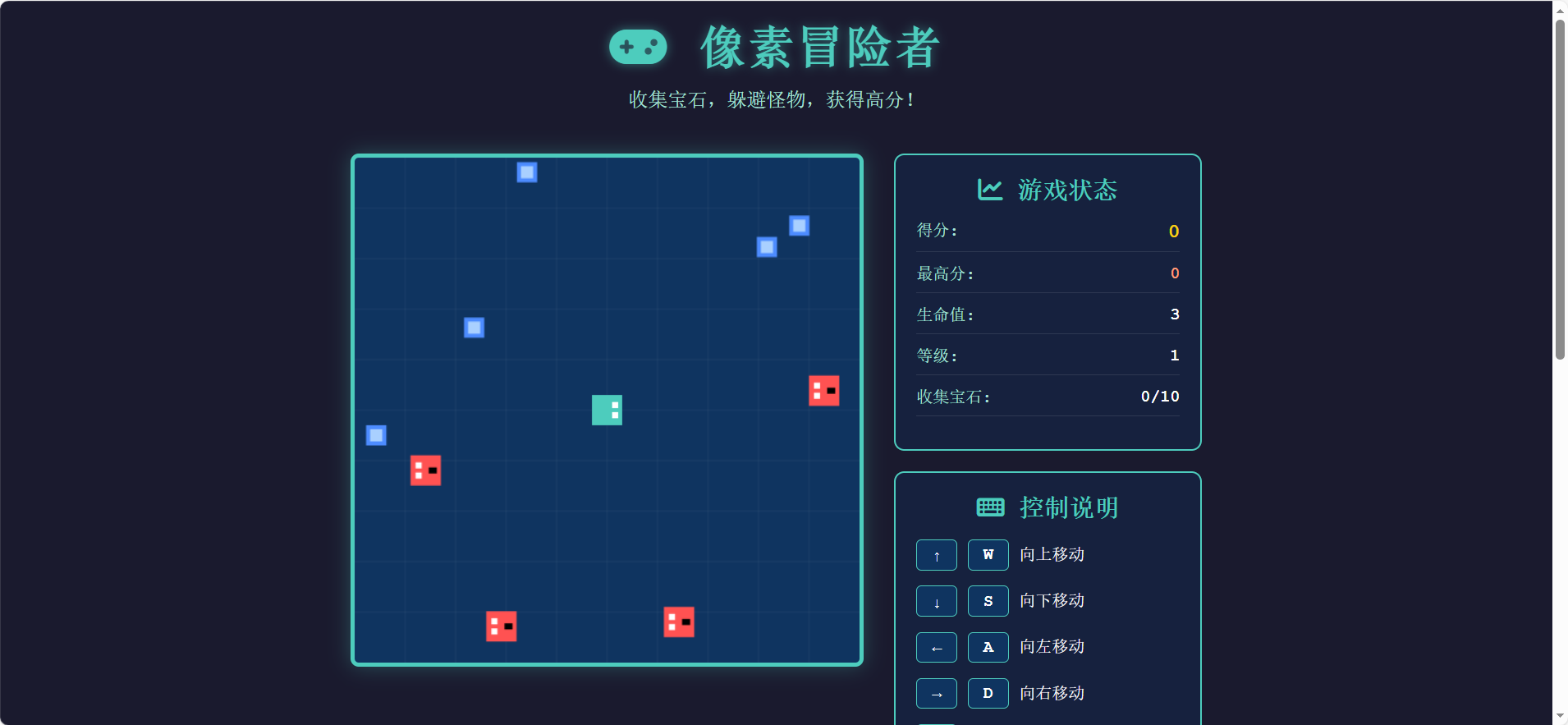 一个使用HTML5 Canvas和JavaScript开发的像素风格网页游戏。控制像素冒险者收集宝石,躲避怪物,获得高分!